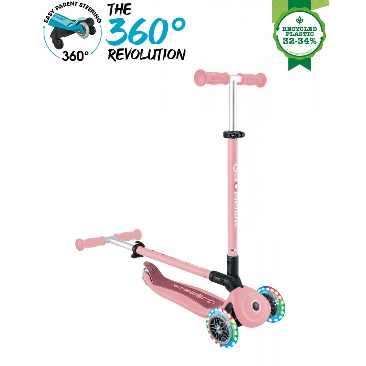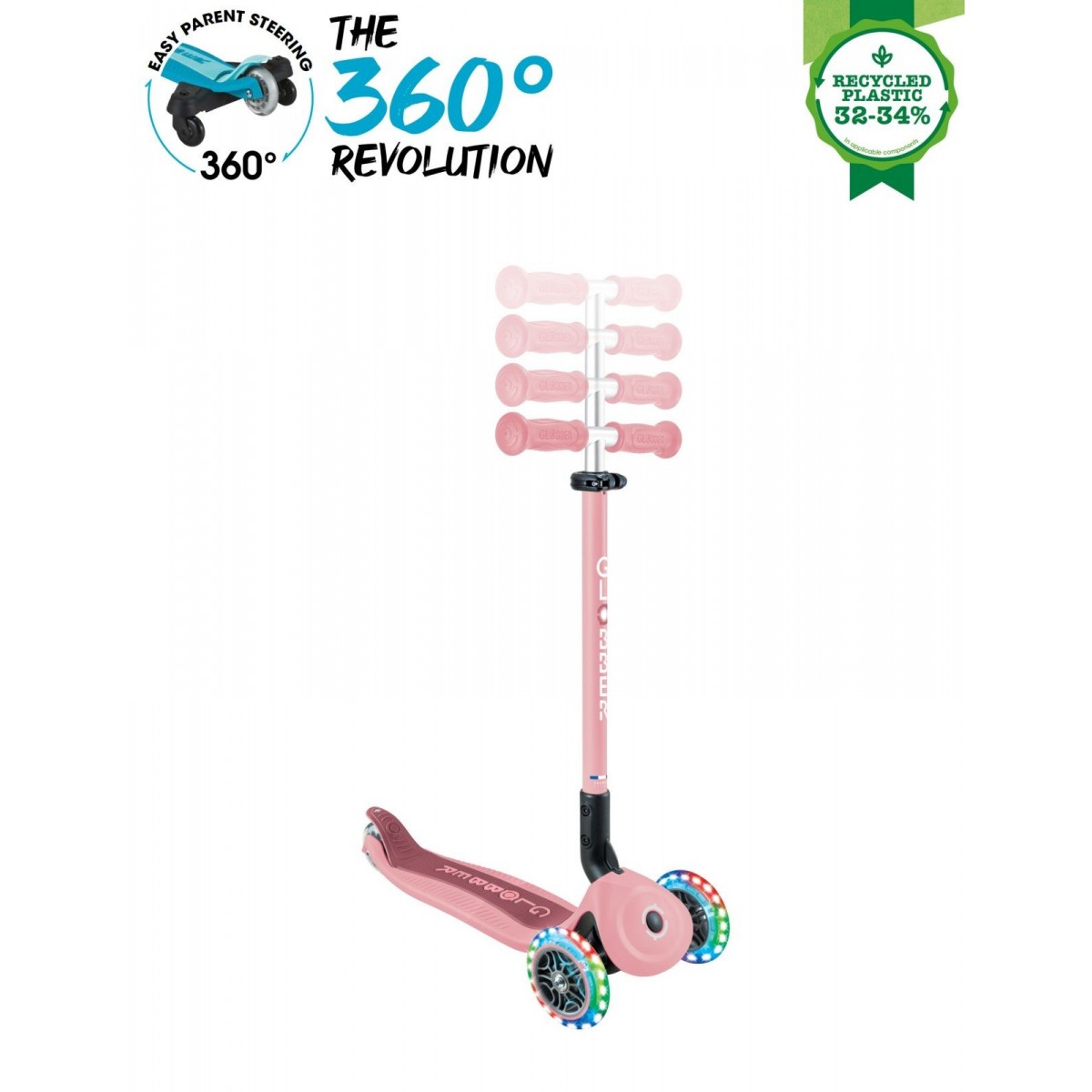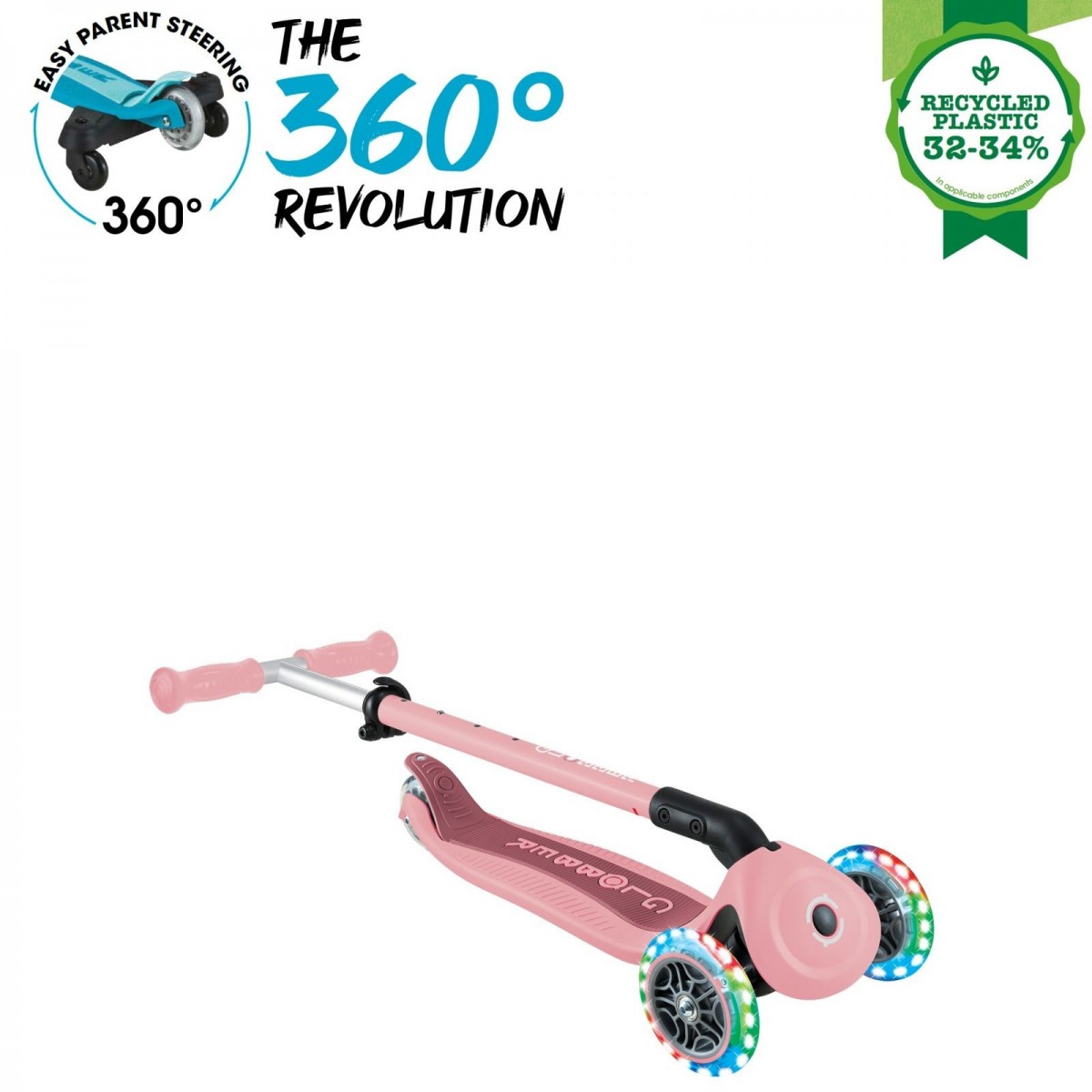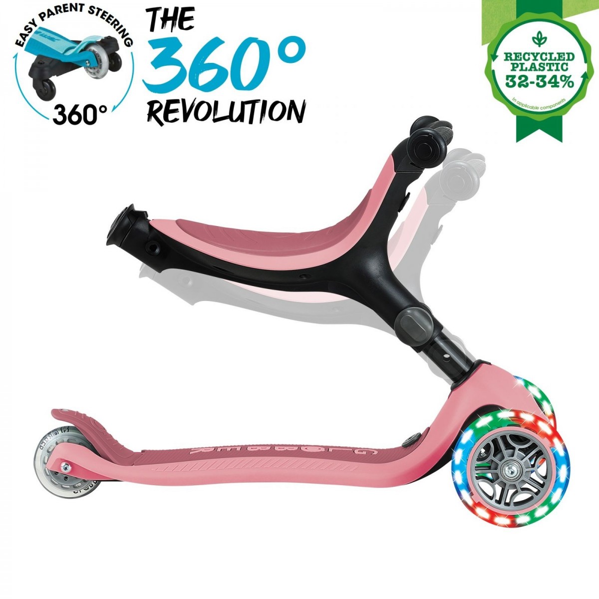 GO•UP ACTIVE LIGHTS 360 este echipat sistem patentat de control parental la 360, în modul ride-on, un design 100% fără unelte, un sistem patentat de pliere și blocare a direcției, un scaun și un T-bar ajustabil, un deck durabil și roți care se luminează cu LED fără baterii.