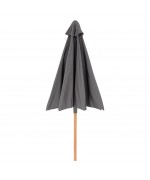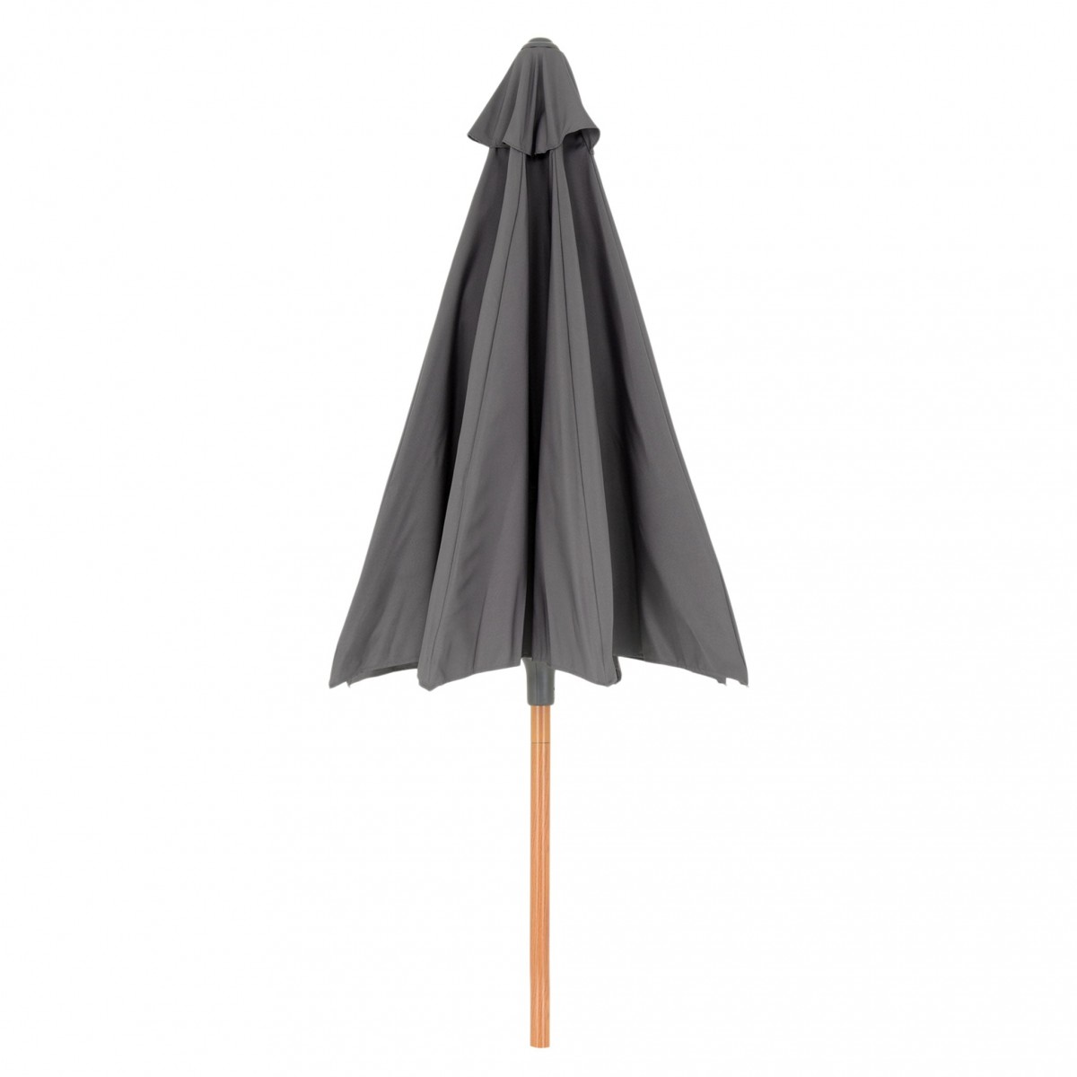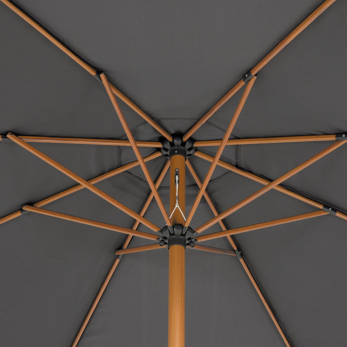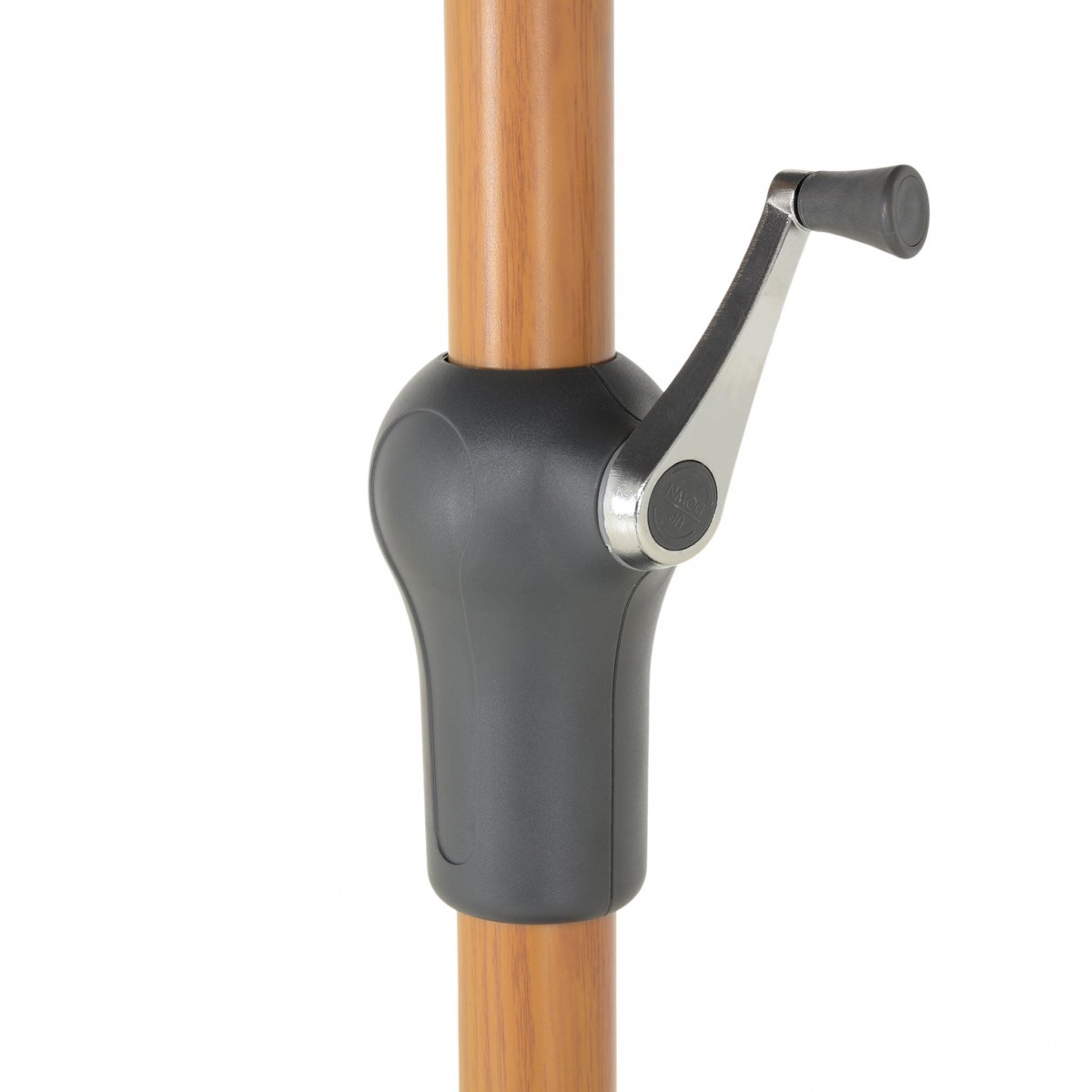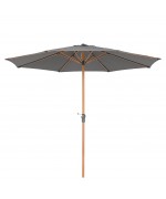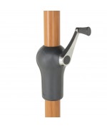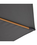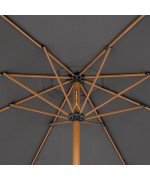 Umbrela este realizata din aluminiu si este vopsita cu aspect de lemn, in timp ce palaria sa este confectionata din poliester cu protectie impotriva umezelii.