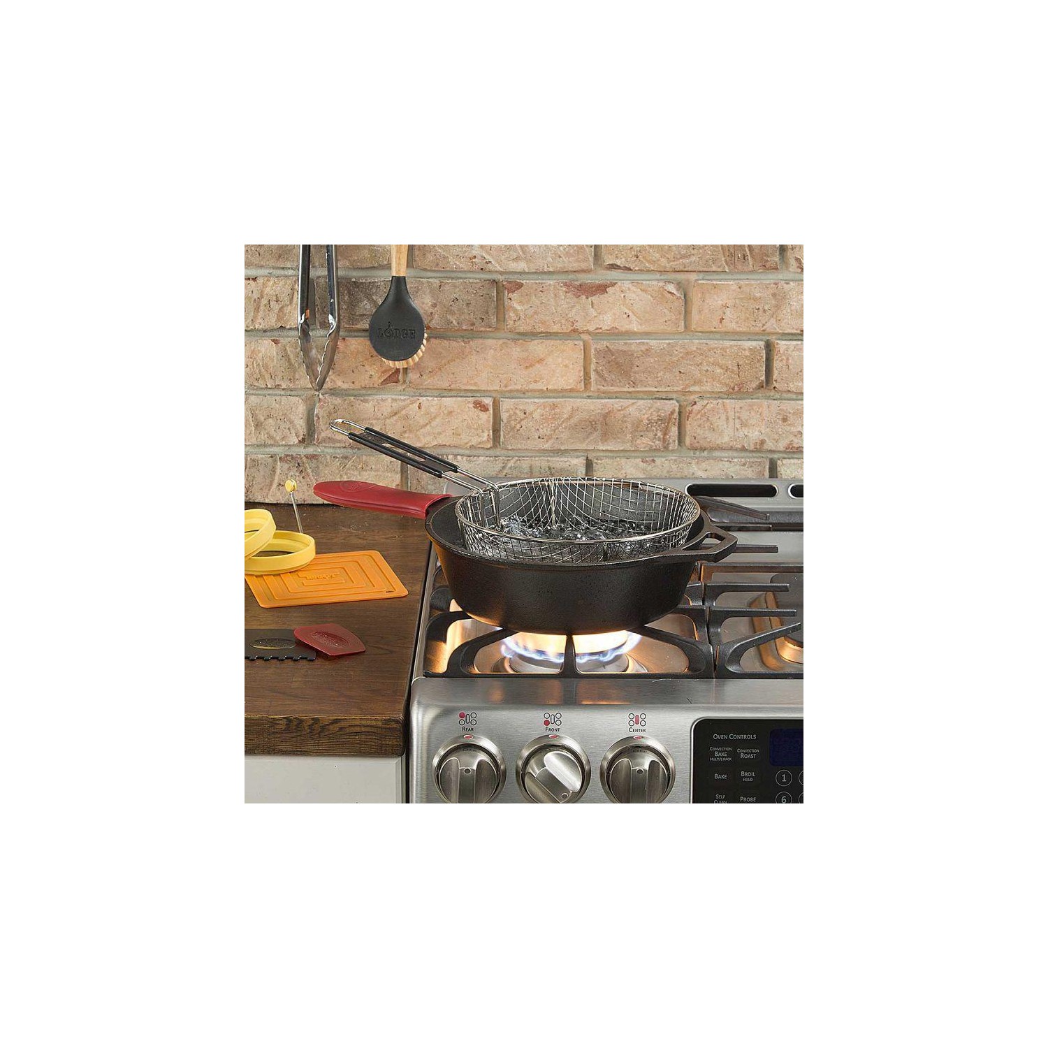 Prajiti-va alimentele preferate in profunzime folosind cosul pentru prajire din otel inoxidabil care se potriveste cu ceaunele Lodge sau cu orice alt ceaun de dimensiuni asemanatoare.