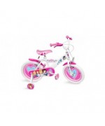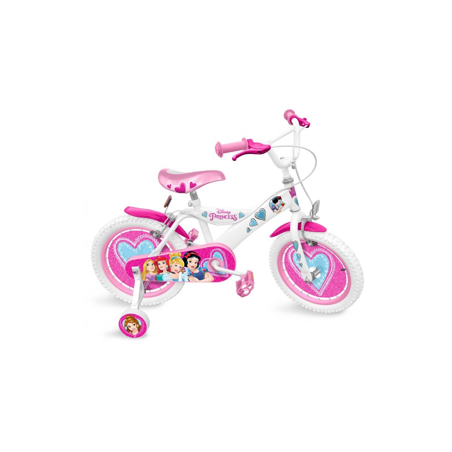 Bicicleta Disney Princess 16", vopsita in roz si alb, este decorata cu indragitele printese din desenele animate Disney si diverse motive florale.